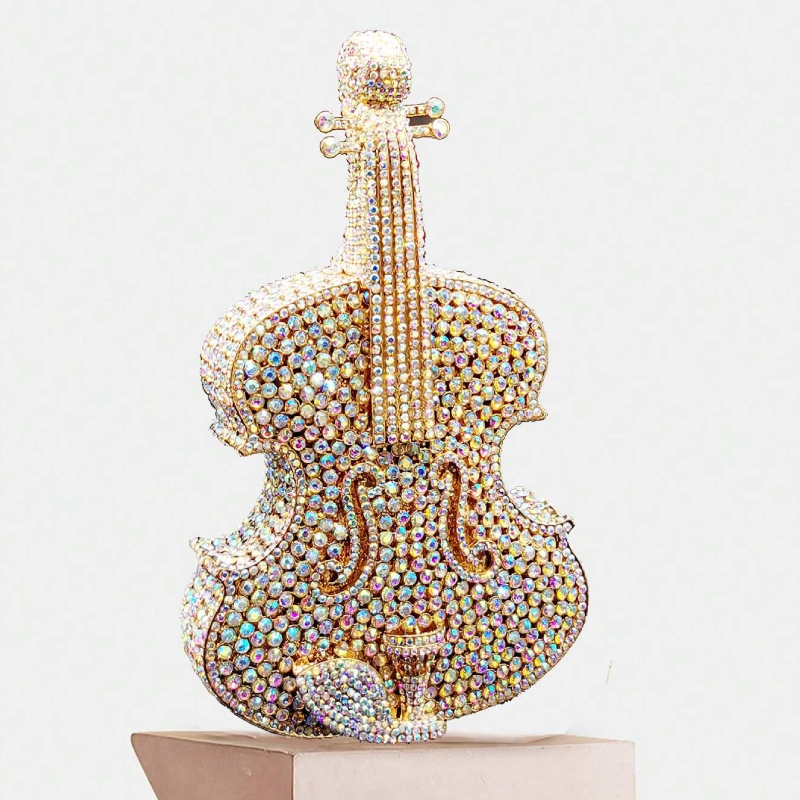 Eine atemberaubende, handgefertigte Clutch in Form einer Geige, die mit bunten Kristallen verziert ist.