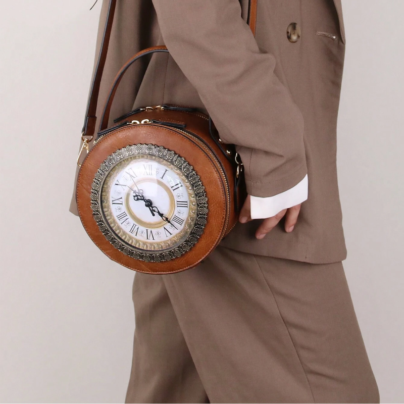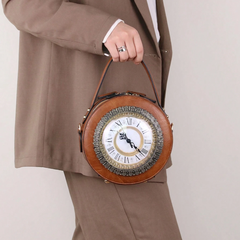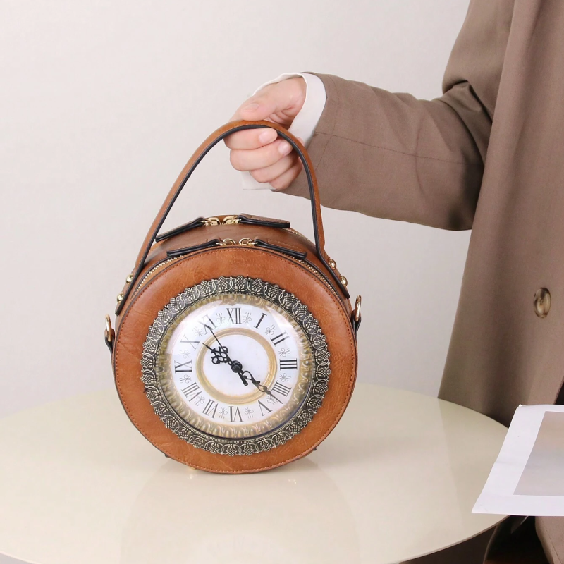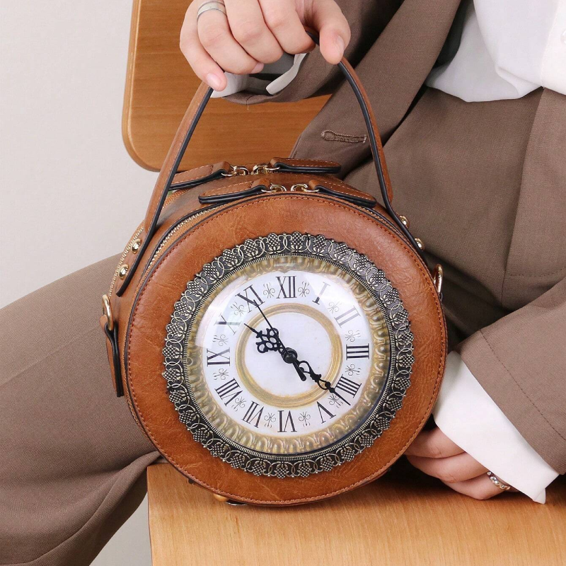Eine einzigartige und stilvolle Handtasche in Form einer Uhr im Vintage-Stil.
